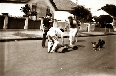 Naquele tempo costumava-se fazer as festas de casamento no quintal de uma casa, cobrindo-se uma armação em madeira ou bambu com encerados de caminhão e forrando-se o chão com palha de arroz. Na foto, meus irmãos mais velhos, Lino e Ítalo, e meu primo dobrando o encerado utilizado na festa do casamento de minha irmã. Este quarteirão fica na Rua Campos Sales, entre a General Osório e a José Francisco Paschoal.